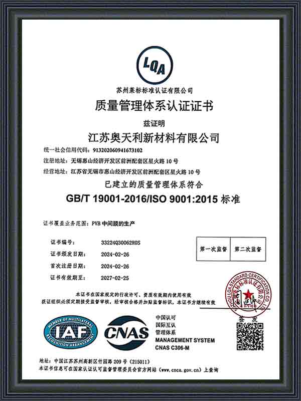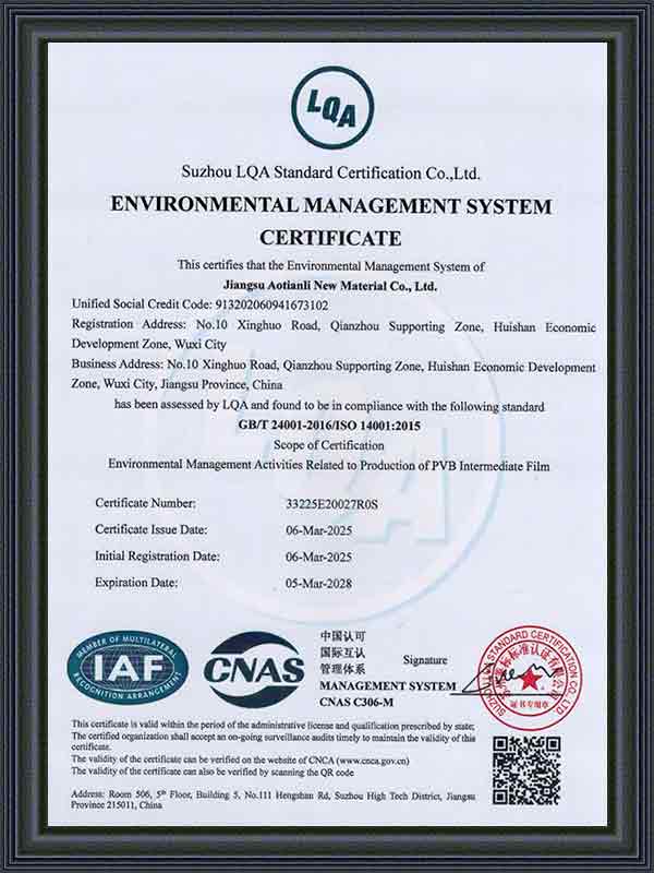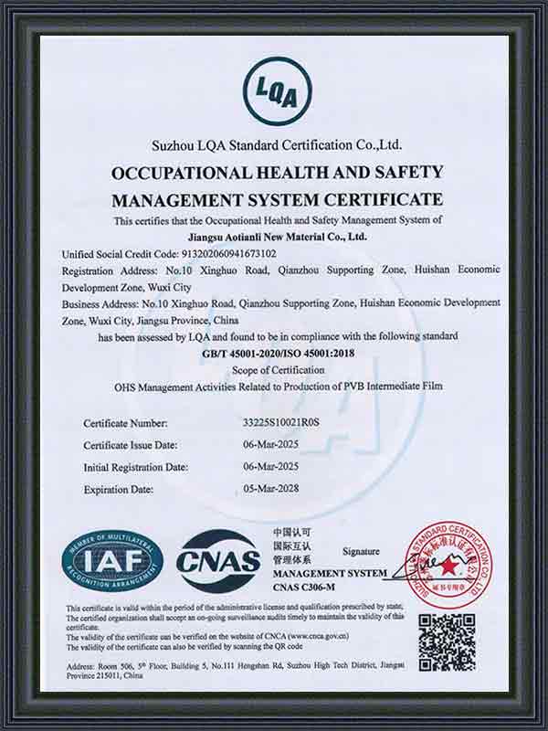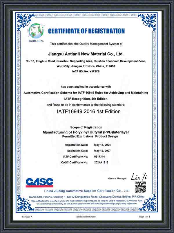 Jiangsu Aotianli New Material Co., Ltd. sa zameriava na výskum a vývoj, výrobu a predaj vysokovýkonných polyvinylových butyral ( PVB ) filmy. Svoj PVB medzivrstvový film sa široko používa v troch hlavných oblastiach Architektonický , Automobilový a Fotovoltaický Vďaka svojim vynikajúcim fyzikálnym vlastnostiam, chemickej stabilite a charakteristikám ochrany životného prostredia. Tento produkt má základné výhody vysokej transparentnosti, silnej adhézie, odolnosti proti nárazu a odolnosti proti poveternostným vplyvom a zaväzuje sa poskytovať bezpečné, efektívne a udržateľné riešenia pre globálnych zákazníkov.